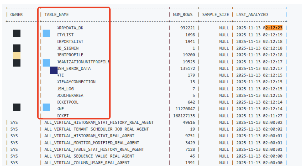 2.查看表的统计信息(DBA_TAB_STATISTICS)按照last_analyzed时间字段列降序查询