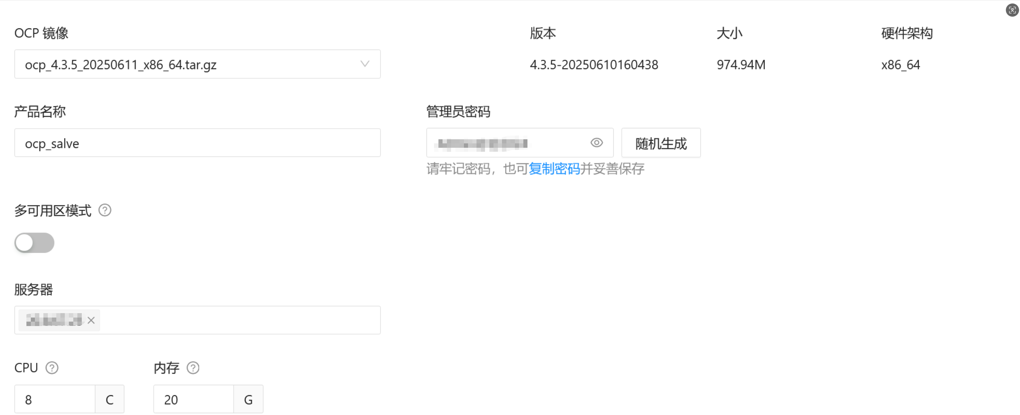选择对应架构的ocp版本-输入产品名称、密码及安装服务器。