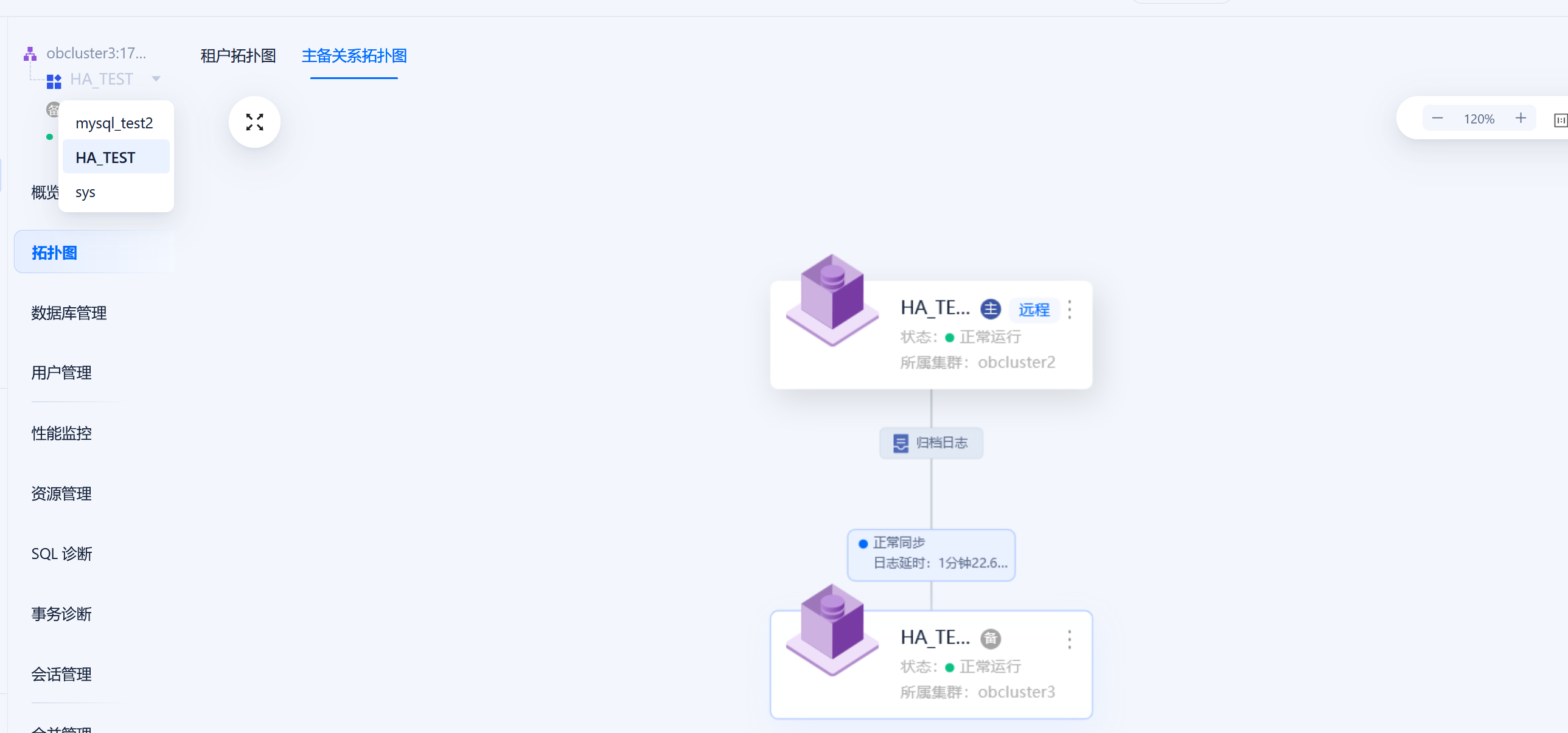 SQL执行完成后,刷新备OCP页面,即可看到接管的OB集群中备租户的主备关系恢复正常。