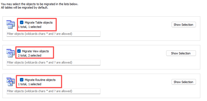 选择迁移的数据对象,表迁移默认勾选,选择勾选迁移View和Routine