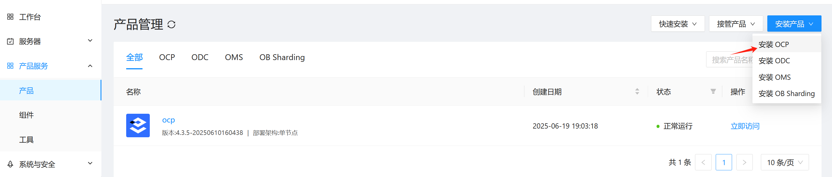 3.点击OAT 右上角”安装产品”中”安装OCP”。