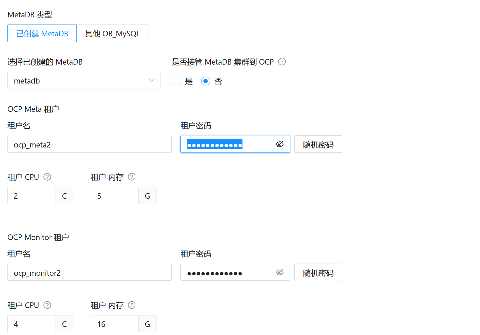 填写相关metadb集群管理OCP产品的需创建的租户信息。