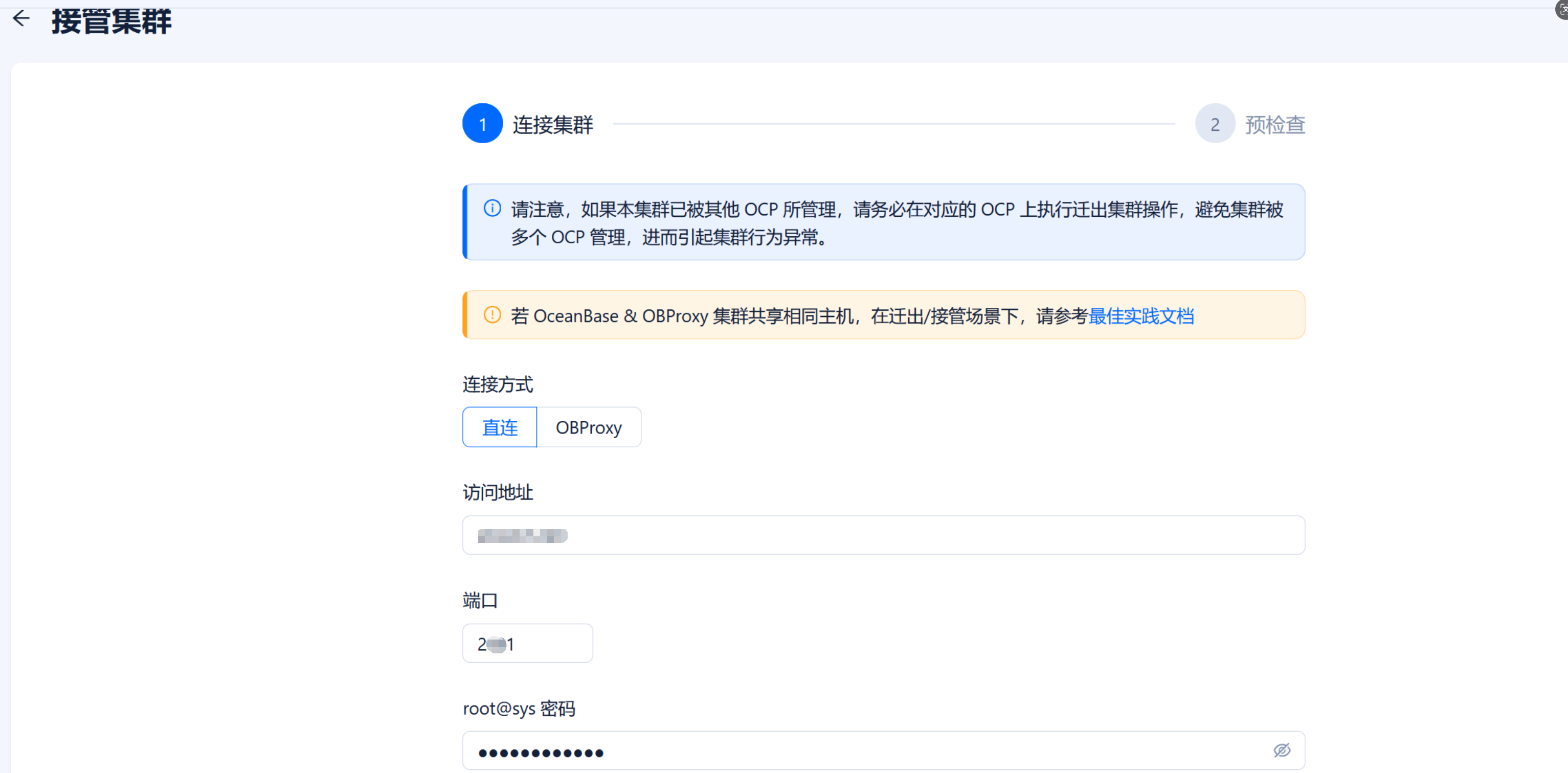 填写对应集群的sys租户连接串信息,点击“下一步”。