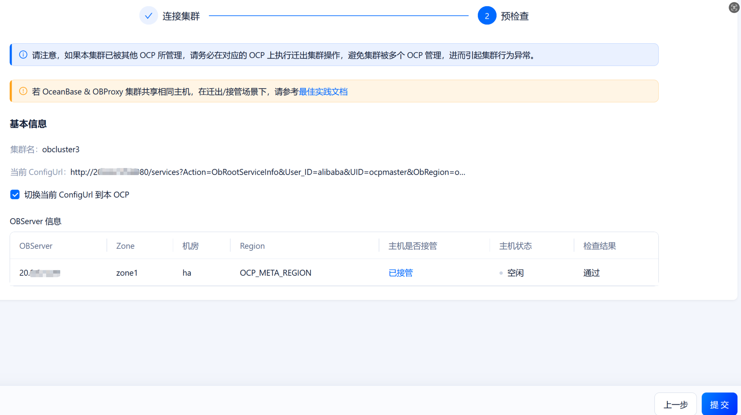 5.等待OCP安装任务到步骤:takeover_metadb,输入:http://20.x.xx.25:8080/进入页面填写主OCP的meta租户root用户的连接串信息,完成接管。