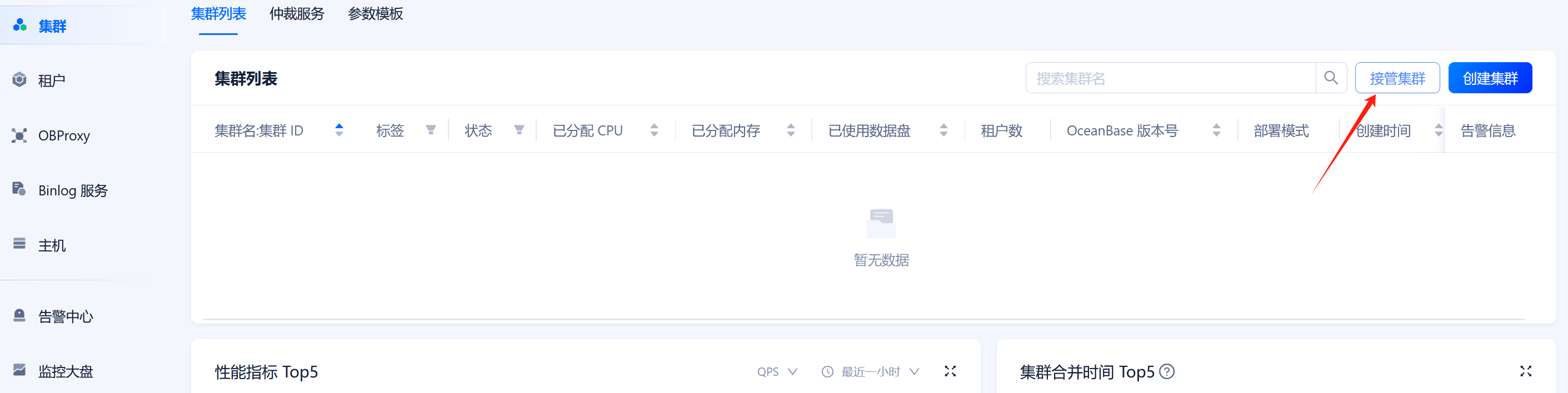 7.接管之前备OCP中的集群,点击OCP中”集群”栏的”接管集群”。