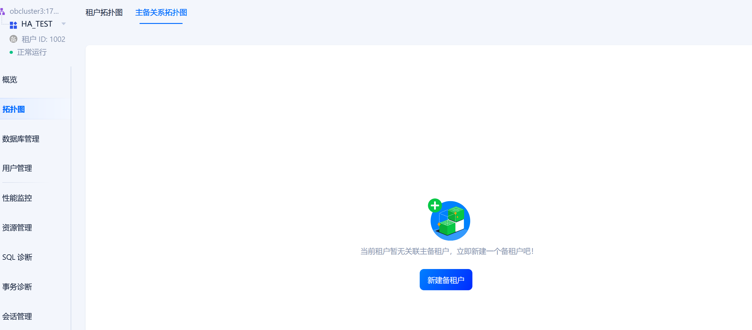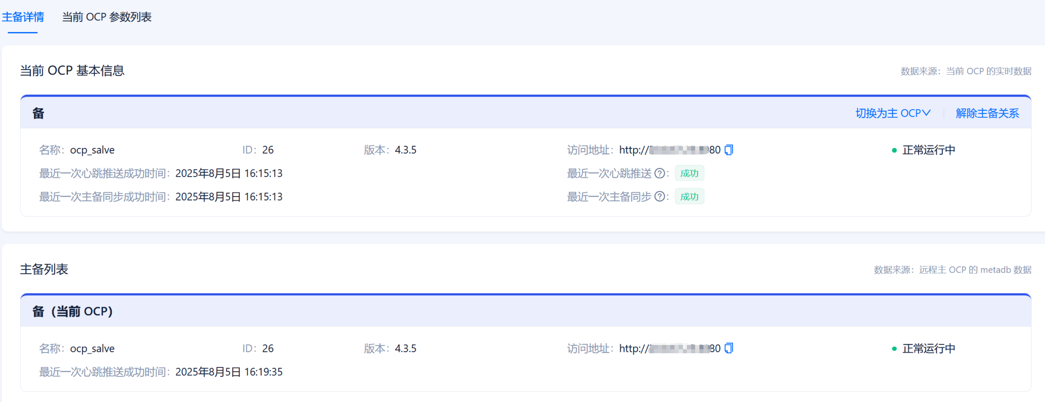 SQL执行完成后,刷新备OCP页面,即可看到接管的OB集群中备租户的主备关系恢复正常。