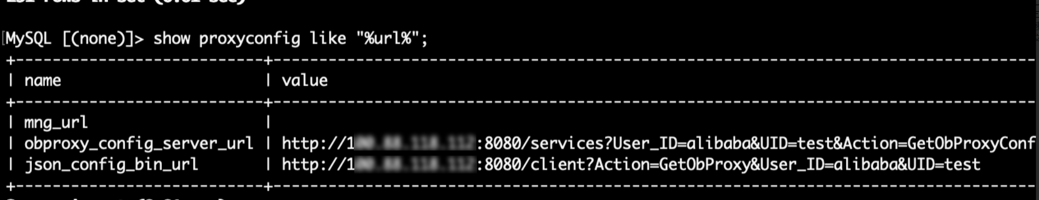 ALTER proxyconfig SET obproxy_config_server_url = 'http://$域名/services?User_ID=alibaba&UID=test&Action=GetObProxyConfig&ObproxyClusterName=obproxy_cu2';
