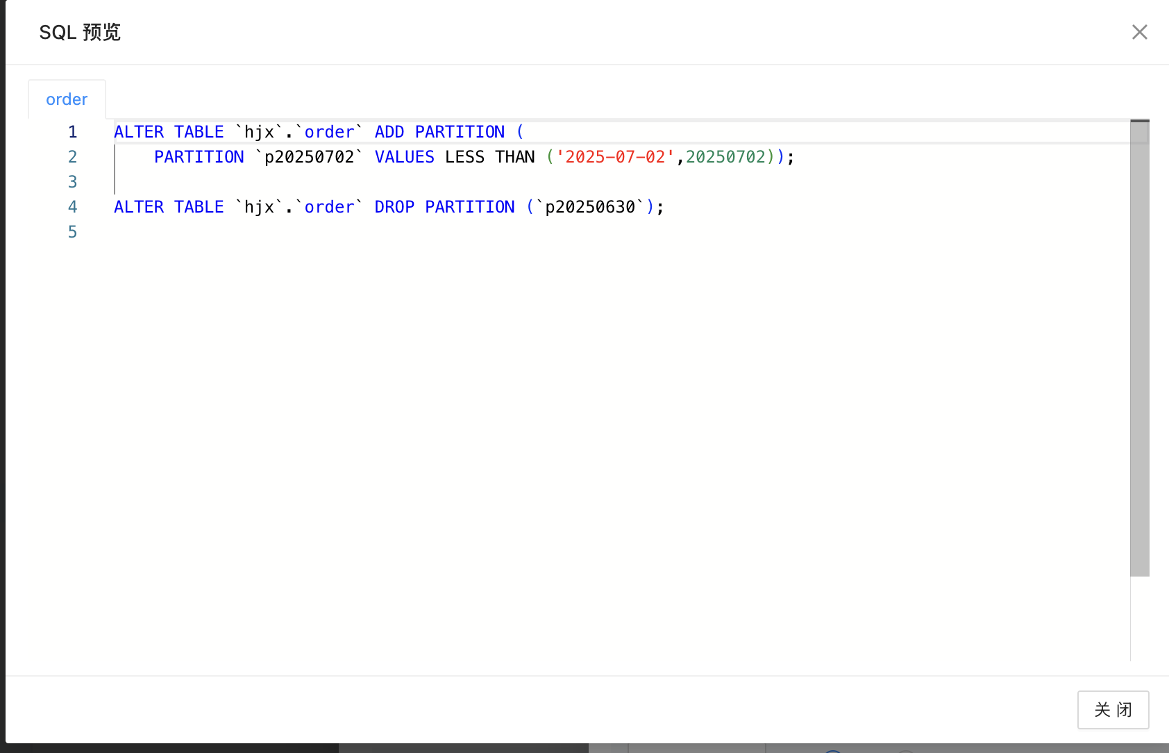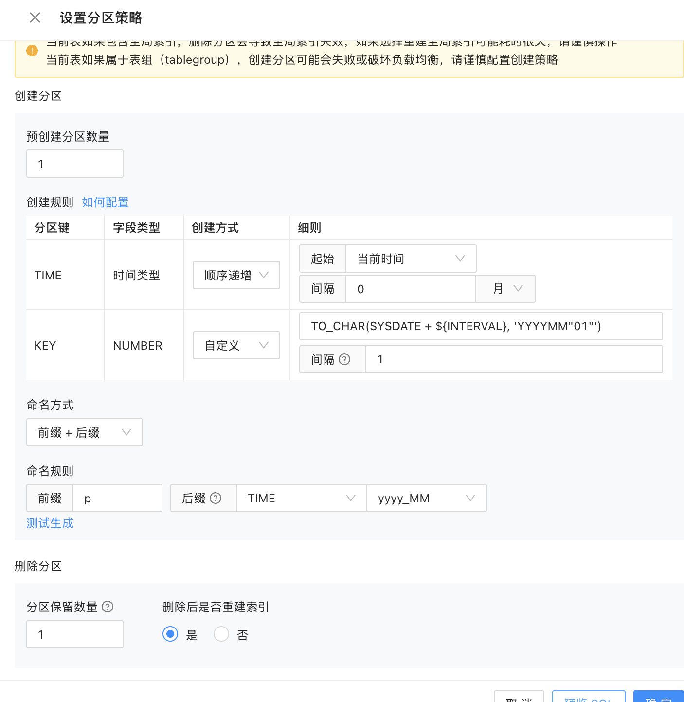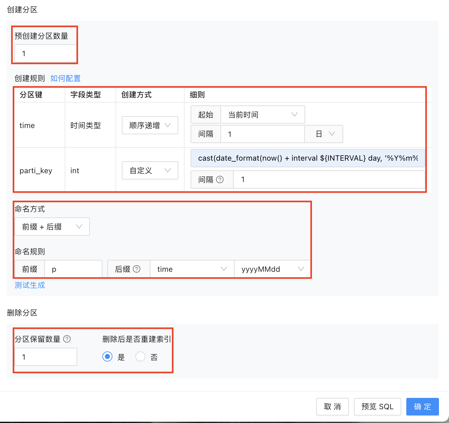 c. 分区配置配置完成后可以点击预览SQL检查是否正确
