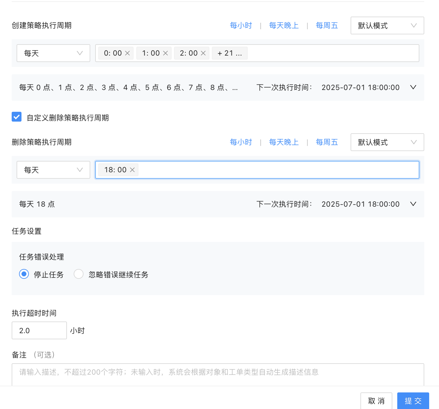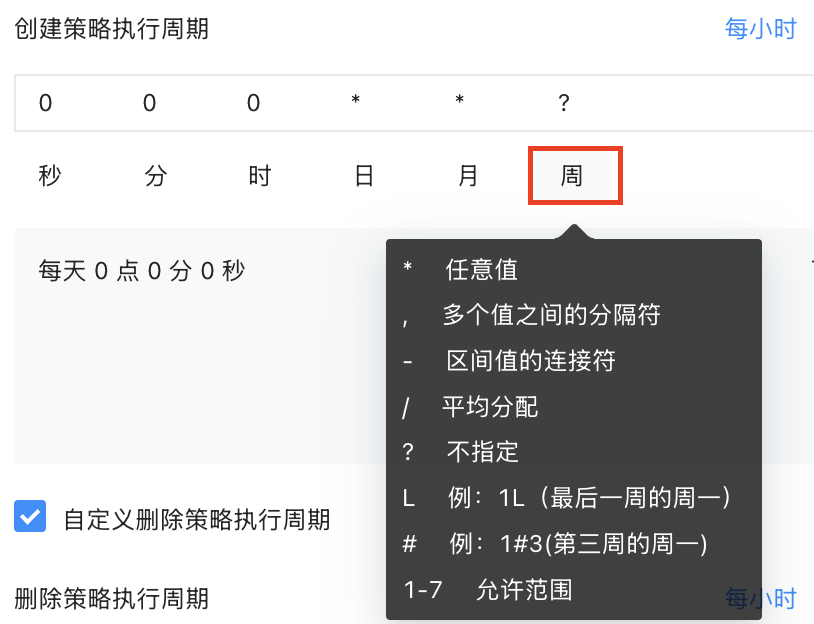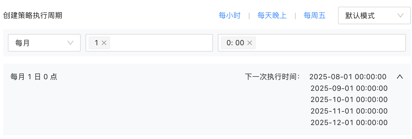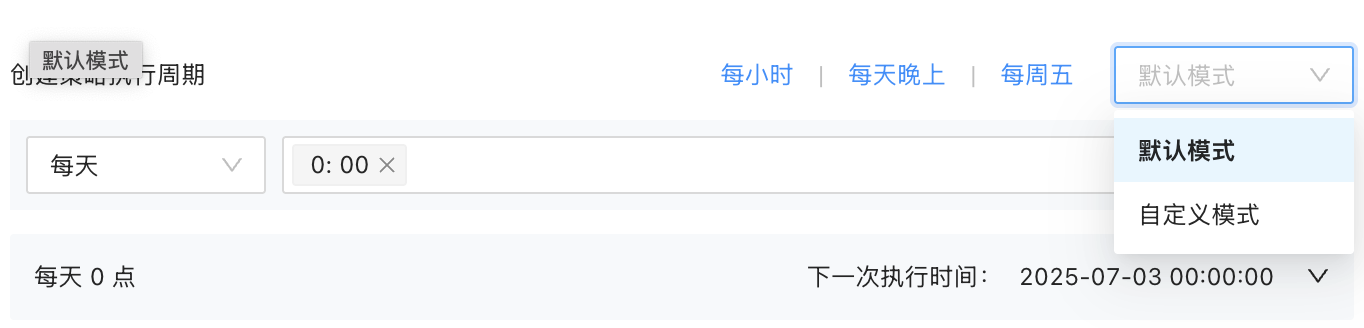 根据业务需求,设置创建分区策略和删除分区策略的执行时间。有默认模式和自定义模式两种模式。