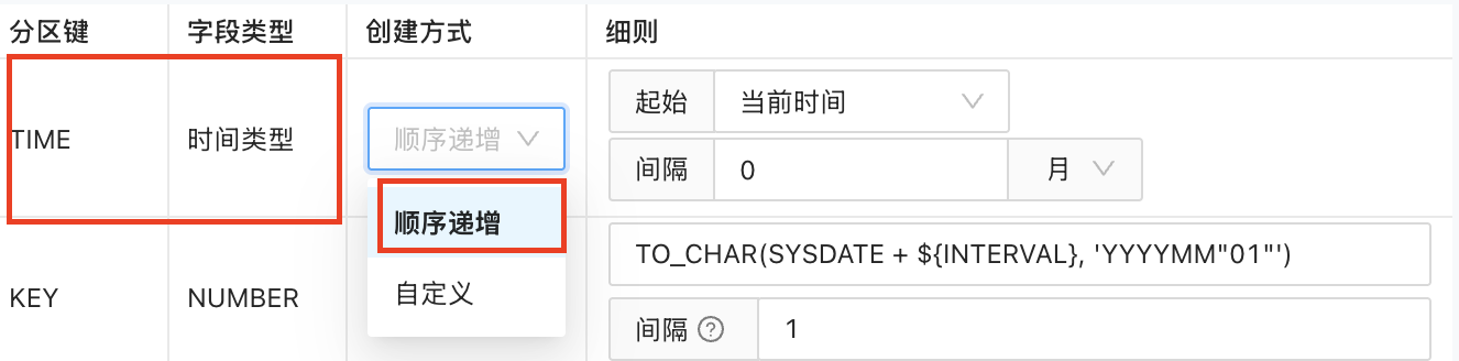 仅适用于时间字段类型,时间字段创建的时候系统默认选择顺序递增的创建方式,可以更改为自定义的创建方式。