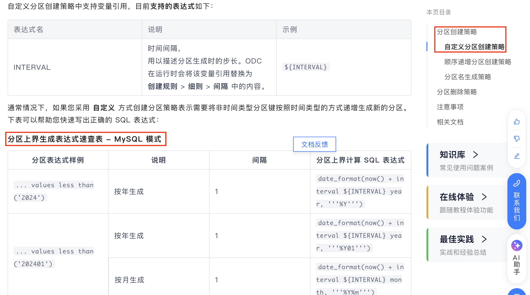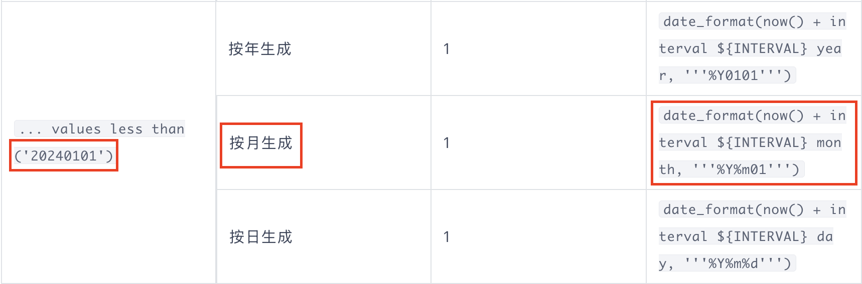 我们可以在官方文档中找到对应的SQL表达式,详情见 分区创建策略 ,点击目录 分区创建策略 下的 分区名生成策略 - 分区名生成表达式速查表-MySQL 模式