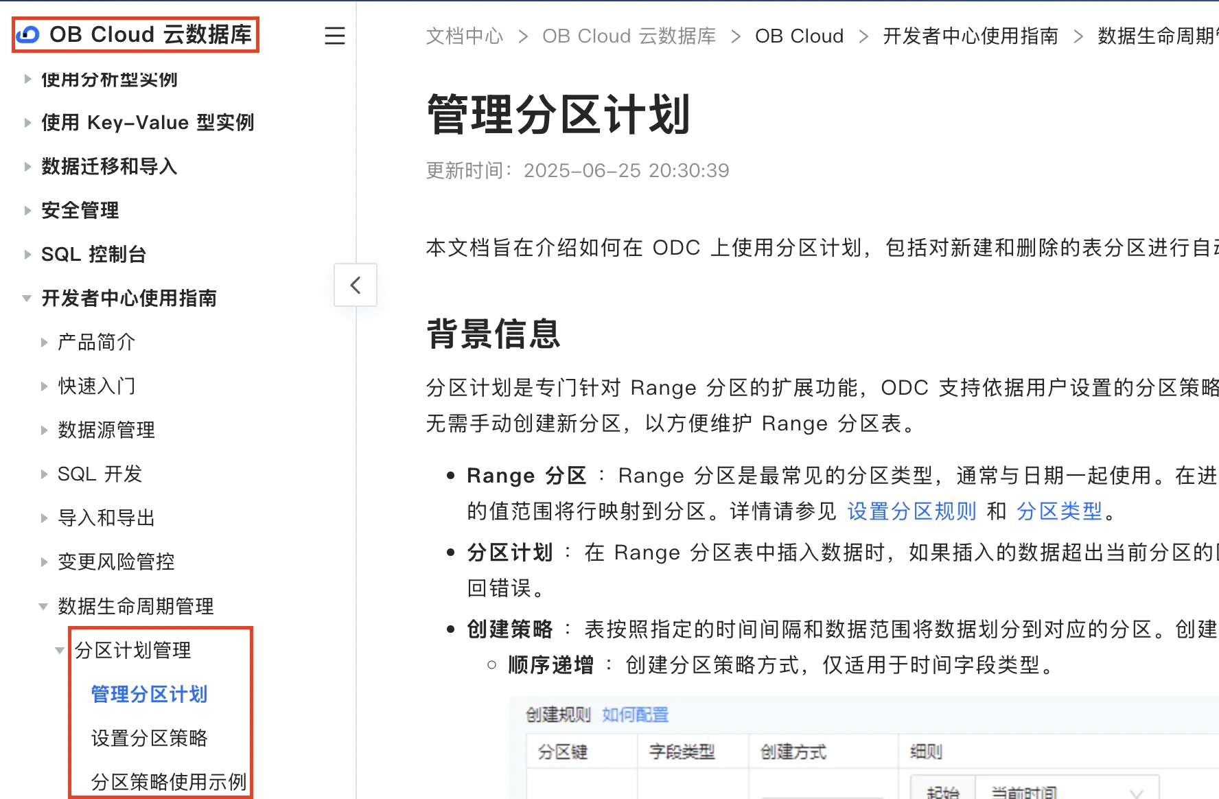 我们可以在ODC配置中点击 分区创建策略 ,来查看官方文档说明。