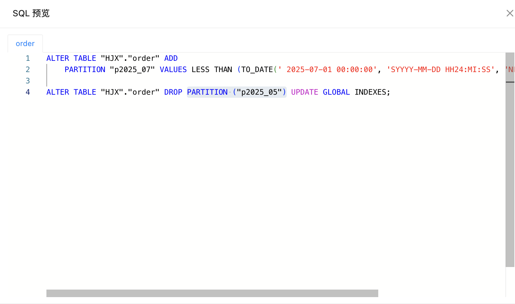CREATE TABLE "order" ("TIME" DATE NOT NULL ENABLE,"KEY" NUMBER(*,0) NOT NULL ENABLE,"NAME" VARCHAR2(120) DEFAULT NULL) COMPRESS FOR ARCHIVE REPLICA_NUM = 1 BLOCK_SIZE = 16384 USE_BLOOM_FILTER = FALSE TABLET_SIZE = 134217728 PCTFREE = 0partition by range("TIME", "KEY")(partition "p2025_05" values less than (TO_DATE(' 2025-05-01 00:00:00', 'SYYYY-MM-DD HH24:MI:SS', 'NLS_CALENDAR=GREGORIAN'),20250501),partition "p2025_06" values less than (TO_DATE(' 2025-06-01 00:00:00', 'SYYYY-MM-DD HH24:MI:SS', 'NLS_CALENDAR=GREGORIAN'),20250601));