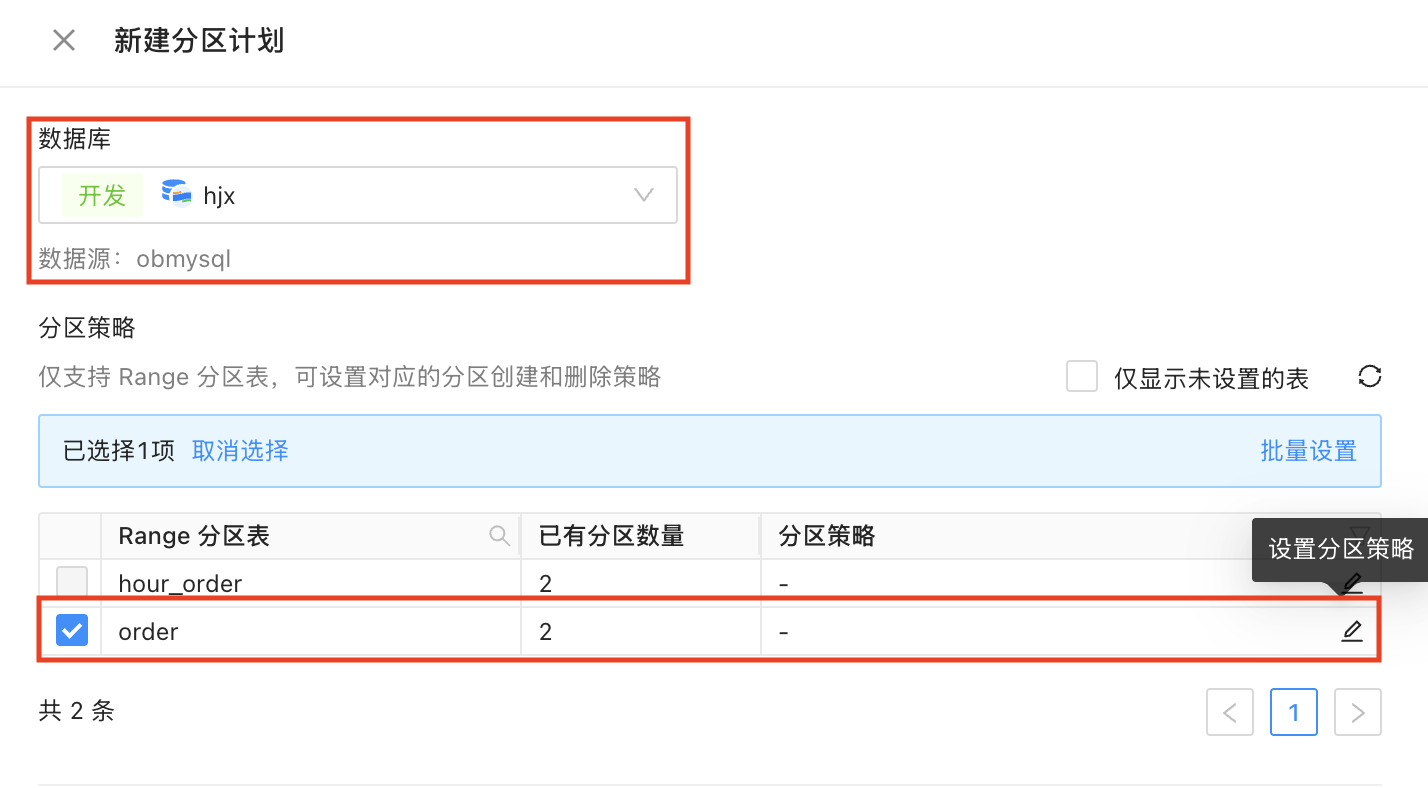 示例:在数据源 obmysql 下数据库 hjx 中,每天对 day_order 表设置创建分区策略和删除分区策略。