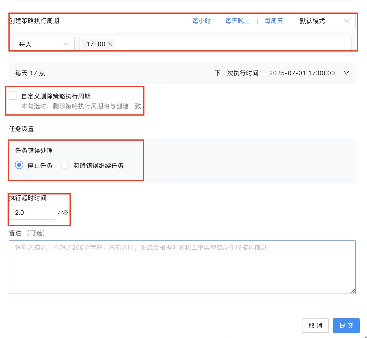 填写策略的执行周期,即触发时机(此处为了快速验证结果,没有按照业务逻辑来设置)