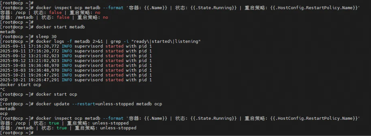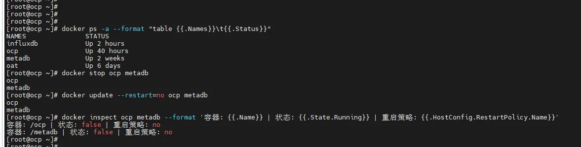 docker inspect ocp metadb --format '容器: {{.Name}} | 状态: {{.State.Running}} | 重启策略: {{.HostConfig.RestartPolicy.Name}}'